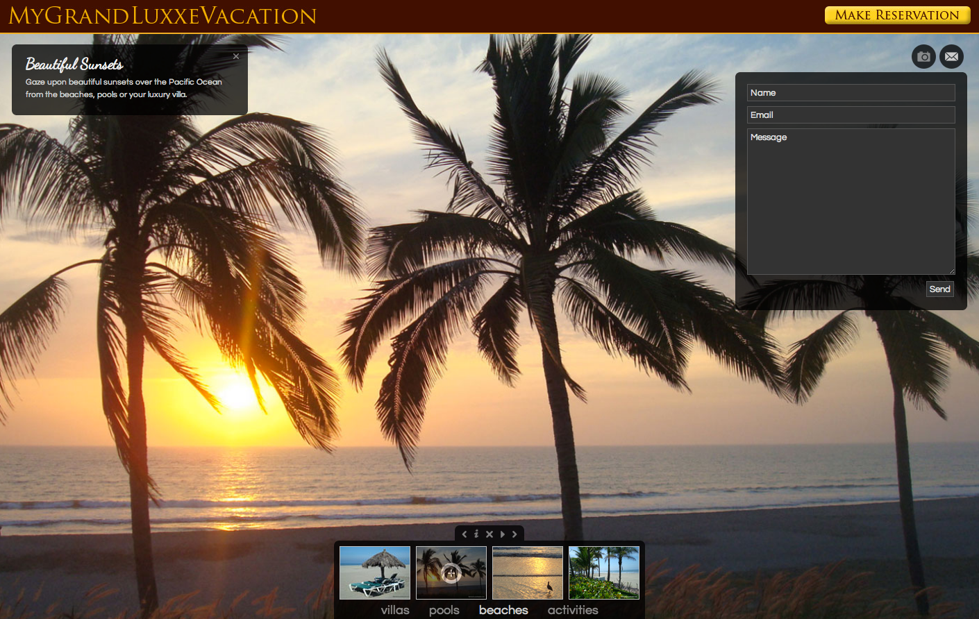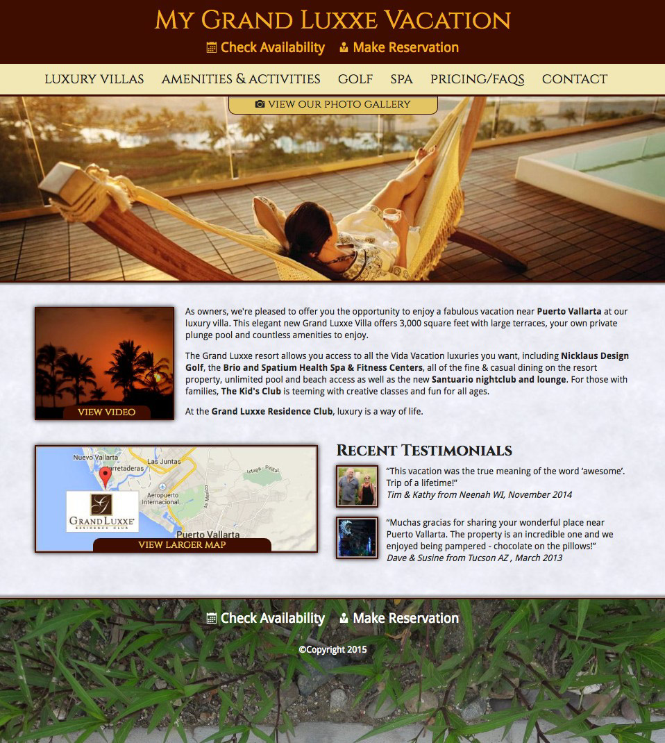I designed and built this brochure website for the owner of a luxury timeshare condo outside Puerto Vallarta, Mexico. The timeshare owner requested a website to showcase photos, provide activity and rental information and a reservation/contact form to prospective renters.