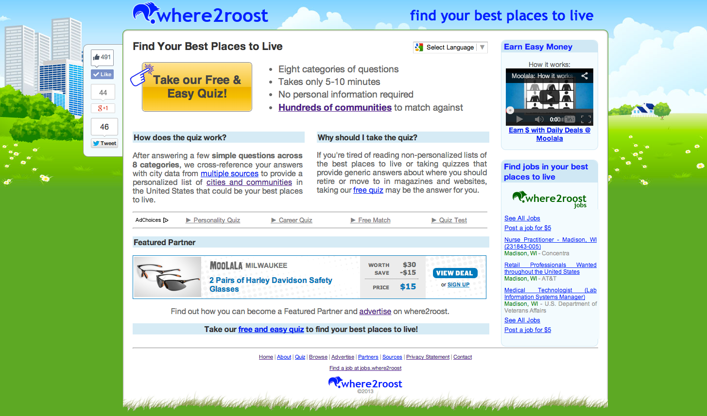 Where2roost.com is a project I used to refine my skills in PHP and jQuery. The goal is to to provide the User with a personalized list of cities and communities in the United States that they may be interested in living. 500+ Likes on Facebook and counting!